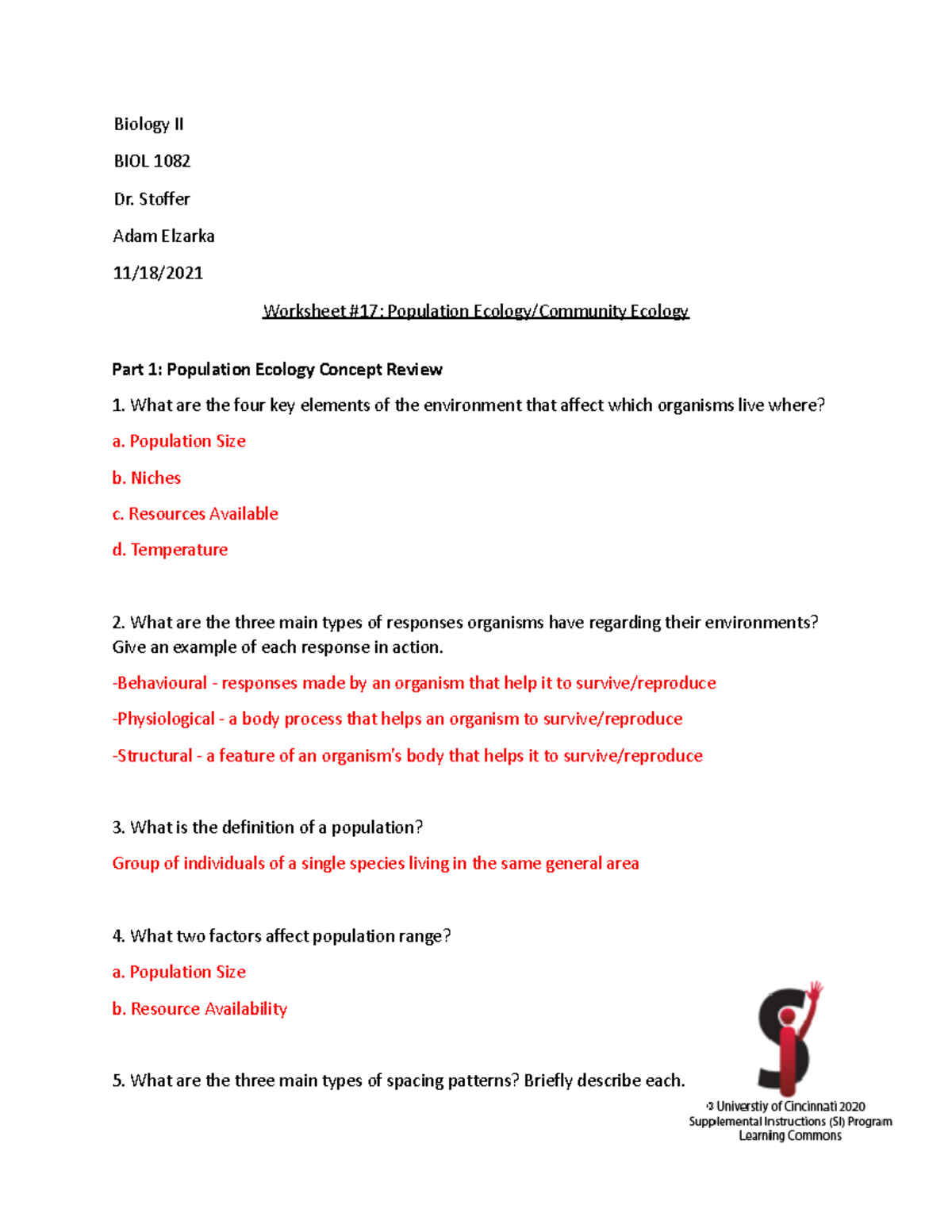 Ecology Review Worksheet #1 Flashcards | Quizlet ex. deer community all of the different populations that live in the same area ex. rabbit ecosystem all organisms that live in a place together with their physical environment ex. bear biosphere all life on earth ex. atmosphere what is the ecosystem made up of? living and nonliving components what are biotic factors? Ecology Review Worksheet (1).pdf - Jonna Odom 01/14/21 Name... Name _______________________________________ Date ______________ Period __________Ecology Review Worksheet #1Main Idea:Ecologists study environments at different levels of organization.Write a description of each level of organization in the table.Also, provide an example for each level.Level DescriptionExample1. Organism2. Population3. Community4. ecology-review-worksheet-1-answers - Studylib Name Answers! Date ______________ Period __________ Ecology Review Worksheet #1 Main Idea: Ecologists study environments at different levels of organization. Write a description of each level of organization in the table. Also, provide an example for each level. Level 1. Organism 2. Population 3. Community 4. Ecosystem 5.