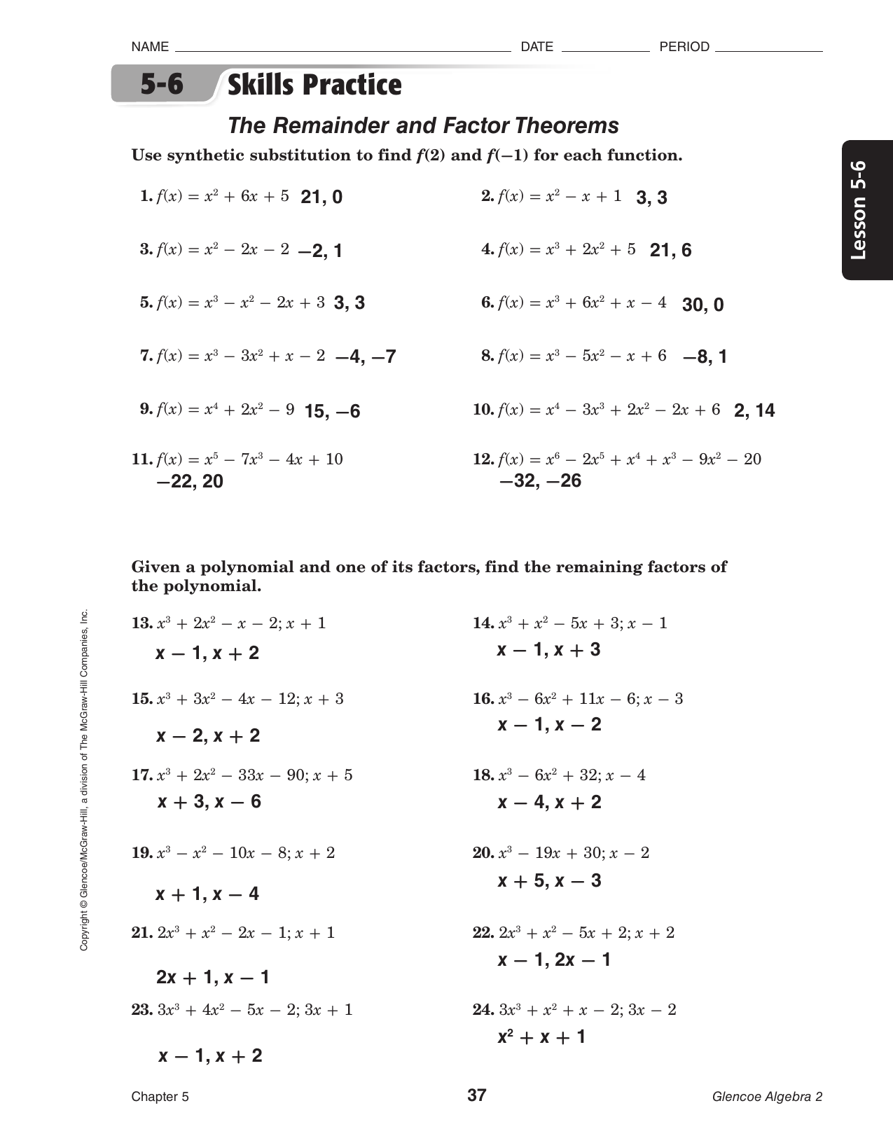 The remainder and factor theorems worksheet answers. Quadratic function calculator with solution Sep 06, 2022 · 8. 27. · solving quadratic equations by completing the square worksheet If f(c) = 0, then x - c is a factor X Times X Equation Calculator Taylor Polynomial Approximation of a Continuous Function • Use of remainder and factor theorems •. equation solver / calculator. Picture Composition Worksheet Exercises for Class 2 Examples ... Sep 16, 2020 · MCQ Questions for Class 11 Maths Chapter 8 Binomial Theorem with Answers; Mechanical Properties of Solids Class 11 Important Extra Questions Physics Chapter 9; Selina Concise Mathematics Class 10 ICSE Solutions Chapter 8 Remainder and Factor Theorems Ex 8A; MCQ Questions for Class 9 Maths Chapter 2 Polynomials with Answers Algebra Help - Calculators, Lessons, and Worksheets - Wyzant ... Algebra Help. This section is a collection of lessons, calculators, and worksheets created to assist students and teachers of algebra. Here are a few of the ways you can learn here… Factors of 135 | How to Find the Prime Factors of 135 by the ... 135/27 = 5 (Factor is 27 and Remainder is 0) 135/45 = 3 (Factor is 45 and Remainder is 0) 135/135 = 1 (Factor is 135 and Remainder is 0) If we divide 135 by any numbers other than 1, 3, 5, 9, 15, 27, 45 and 135, it leaves a remainder value. Hence, the factors of 135 are 1, 3, 5, 9, 15, 27, 45 and 135. Prime Factorization of 135. The process of ...