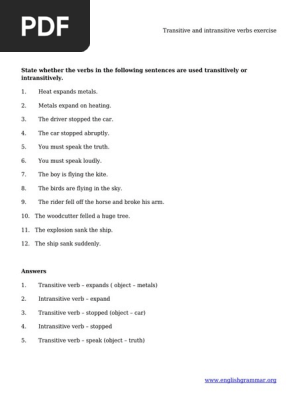 › transitive-orTransitive Or Intransitive Verb Exercise - Home of English ... Jun 04, 2018 · (Intransitive) 4. I received your letter in the morning. (Transitive) 5. I am going to send her some flowers. (Transitive) 6. He has changed a lot since he got married. (Intransitive) 7. Suddenly the child woke up. (Intransitive) 8. The loud noise woke me. (Transitive) 9. Let’s discuss your plans. (Transitive) 10. I heard a lovely song in the ...