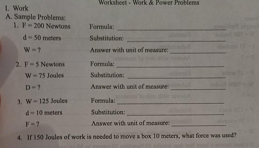 SOLUTION: Calculating Work and Power Problems Worksheet Rating · 1. F = 200 Newtons Formula: W = Fd. d = 50 meters Substitution: W = (200 N)(50 m). W = ? · 2. F = 5 Newtons Formula: d = W/F W = 75 Joules Substitution: ...
