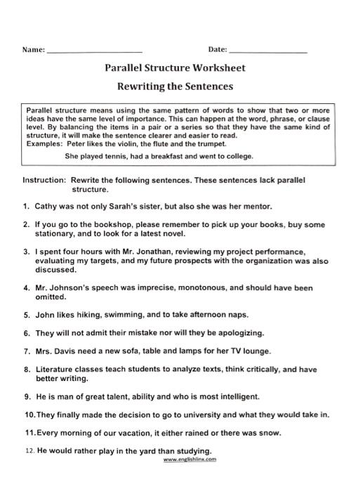 englishlinx.com › parallel-structureEnglishlinx.com | Parallel Structure Worksheets This is the parallel structure worksheets section. Parallel structure is the repetition of a chosen grammatical form within a sentence. Parallel structure means using the same pattern of words to show that two or more ideas have the same level of importance. It brings balance to your writing. It is important to recognize parallel structure and ... parallel sentence structure worksheet parallel structure worksheet identifying worksheets grammar practice text englishlinx sentences answer key predicate subject english answers writing activities lessons write. ... Parallel Structure Worksheet 1 Answer Key - Kidsworksheetfun kidsworksheetfun.com. › wp-content › uploadsPARALLEL STRUCTURE PRACTICE - WORKSHEET 1 - eslwriting.org Aug 10, 2015 · ANSWERS . Practice 1: Edit these sentences to create parallel structure. 1. Mike likes to listen to rock music and reading mystery novels. • Mike likes to listen to rock music and read mystery novels. 2. Julia is in charge of stocking the shelves, writing orders, and to sell computers. Parallel Structure - Advanced Practice | Academic Assistance and ... Parallel Structure - Advanced Practice Advanced Practice Click to download a PDF of these practice activities. Click to download a PDF of this answer key. The paragraph below contains many instances of grammatical and logical parallel structure. In the text box below, paste or type all the sentences that contain parallel structure.