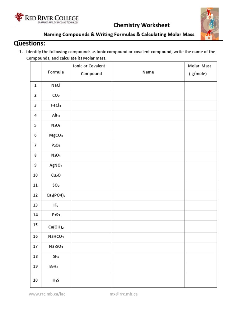 Calculating molar mass worksheet with answers. PDF Molar Mass Worksheet - Everett Community College Molar Mass Worksheet W 339 Everett Community College Tutoring Center Student Support Services Program Find the molar masses of the following compounds: 1) LiI 2) PbCO 4 3) Mg(OH) 2 4) K 3 PO 4 5) (NH 4) 3 PO 4 6) C 6 H 12 O 6 7) Fe 2 (SO 4) 3 8) Na 3 P 9) AgF 10) NH 4 C 2 H 3 O 2. Solutions All answers are to 4 significant figures. 1) 133.8 g ... Calculating Molar Mass Teaching Resources | Teachers Pay Teachers This chemistry homework page is perfect for students to review how to calculate molar mass from a chemical formula. In the first section, students calculate the number of grams per mole for 9 different substances. Then finally, students answer two historical questions about Avogadro and the mole concept. › how-to-calculate-ph-quickHere's How to Calculate pH Values - ThoughtCo May 02, 2020 · In other words, pH is the negative log of the molar hydrogen ion concentration or the molar hydrogen ion concentration equals 10 to the power of the negative pH value. It's easy to do this calculation on any scientific calculator because more often than not, these have a "log" button. This is not the same as the "ln" button, which refers to the ... Calculating Molar Mass Worksheet With Answers Online Library Calculating Molar Mass Worksheet With Answers Building Services Engineering Spreadsheets The new second edition LEARNING WITH COMPUTERS I (Level Green, Grade 7) is a revision of the first edition project-based text to cover Microsoft Office 2007 and 2010. There is also a companion text, LEARNING WITH COMPUTERS II (Level Orange ...