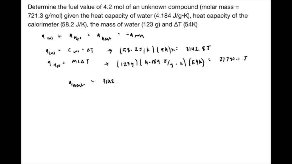 PDF Calorimetry Practice Worksheet (Section 17.2) - NOTAPROTON Calorimetry Practice Worksheet (Section 17.2) 1.) Compound A is burned in a bomb calorimeter that contains 2.50 liters of water. If the combustion of 0.175 moles of this compound causes the temperature of the water to rise 45.00C, what is the molar heat of combustion of compound A (in kJ/mole)? The heat capacity of water is 4.18 J/g 0C. ∆H = -q