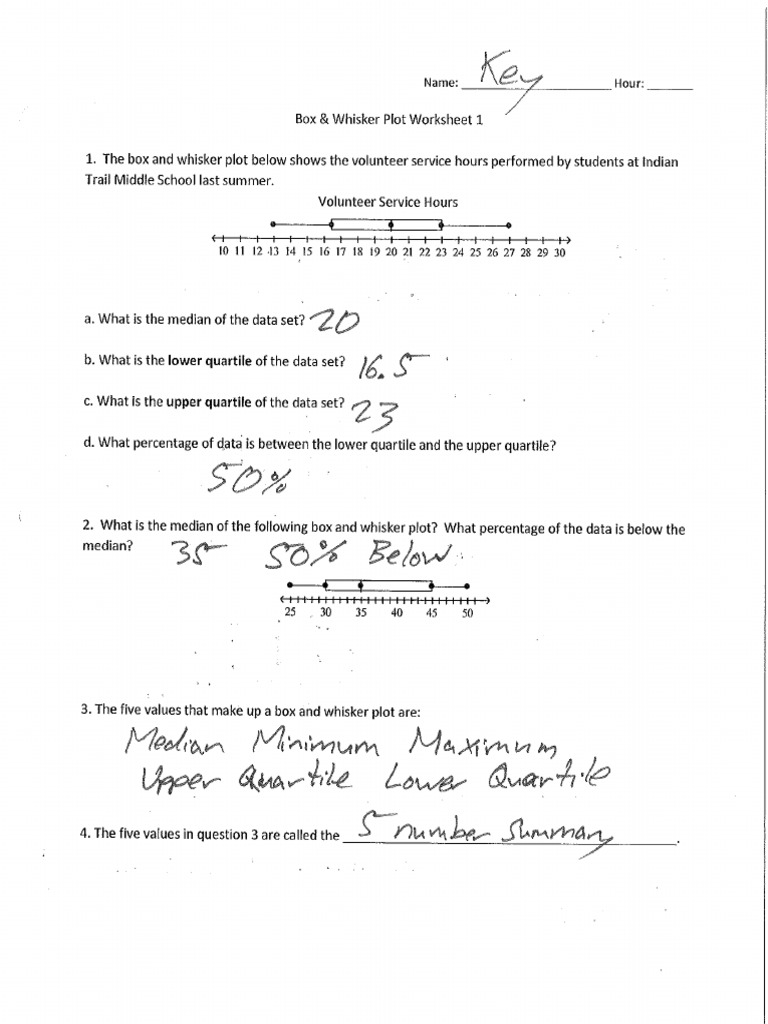 Box And Whisker Plot Worksheet 1 Answer Key Box-and-whisker plot worksheets have skills to find the five-number summary, to make plots, to read and interpret the box-and-whisker plots, to find the quartiles, range, inter-quartile range and outliers. Word problems are also included. These printable exercises cater to the learning requirements of students of grade 6 through high school.