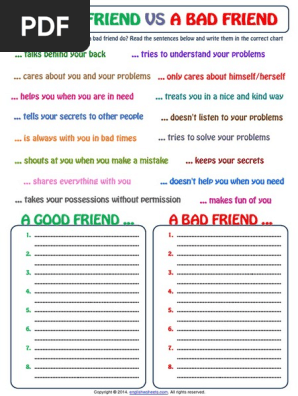 What makes a good friend worksheet. What Makes A Good Friend Teaching Resources Results 1 - 24 of 9300+ ... Included are two "Friend" themed worksheets that would make great additions for "Good Character" or "Character Counts" curriculum. What Makes Me A Good Friend? Teaching Resource Pack Sep 23, 2021 ... A set of two social skills worksheets focusing on the body language of friends. Teach Starter Publishing 2 pages Years: F - 7. Friendship Lessons, Worksheets and Activities - Teacher Planet How to identify what a good friend does. 3. How to practice skills that help people make friends. True friends don't expect anything in return for your ... Good Friend Worksheet Teaching Resources Results 1 - 24 of 8500+ ... Being a Good Friend WorksheetsThese worksheets are the perfect follow up to any being a good friend lesson!