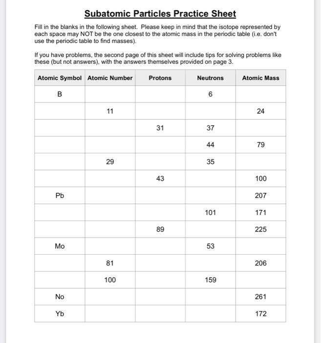 Subatomic particle worksheet answers. Join LiveJournal Password requirements: 6 to 30 characters long; ASCII characters only (characters found on a standard US keyboard); must contain at least 4 different symbols; Subatomic Particles Worksheet (answer key) - Course Hero Subatomic Particles Name_________________________ Directions: Fill in the missing values in the table. Be sure to check whether it is an atom or an ion. Symbol Element Atomic Number Protons Neutrons Electrons Atomic Mass B Boron 5 5 6 5 11 Cr Chromium 24 24 28 24 52 Sn2+ Tin 50 50 69 48 119 C Carbon subatomic particle worksheet discovery of subatomic particle concept map worksheet. 15 pics about discovery of subatomic particle concept map worksheet : subatomic particles worksheet answer key — db-excel.com, 26 subatomic particle worksheet answers - worksheet information and also subatomic particles worksheet answer key | chemistry worksheets, map skills worksheets, … PDF SUBATOMIC PARTICLES and ISOTOPES WORKSHEET SUBATOMIC PARTICLES and ISOTOPES WORKSHEET Complete the following table using the information discussed in class and your Periodic Table. All atoms are neutral. Element Name Atomic Number Mass Number Number of protons Number of neutrons Number of electrons Isotopic notation oxygen 8 17 8 9 8 17 8O phosphorous 15 31 15 16 15 31 15 P