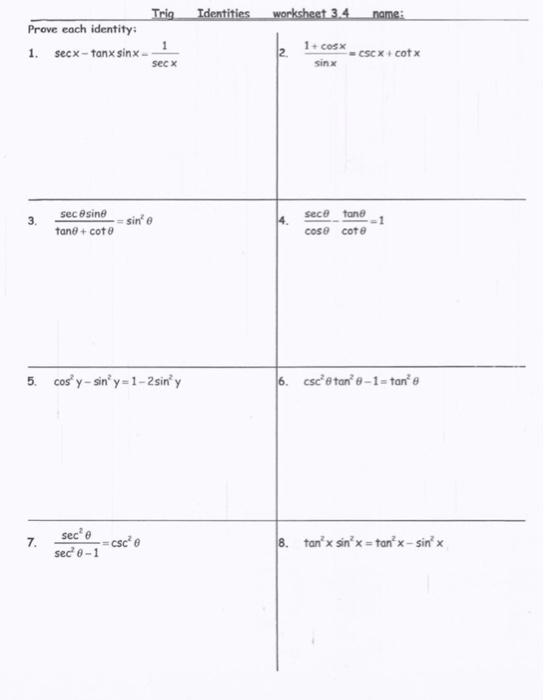 Trig identities worksheet 3.4. Trig Identities 3point4 WS Key.pdf Prove each identity: ... Trig. = CSC. Sin 20. Csc 26=Cs. , го. 26. 5 26. Reed. Identities го. = Sin 20 worksheet 3.4. Solved Trig Identities worksheet 3.4 name: Prove each | Chegg.com Question: Trig Identities worksheet 3.4 name: Prove each identity: 1. Secx-tan x sinx 1 sec x 1 + cos x 2. = CSC X + cotx sinx sece 3. secesine = sin e tane + ... trig identities worksheet with answers 2 - StudyLib Trig Prove each identity; . 1 . secx - tanx SInX - 1 secx Identities worksheet 3.4 name: - 2. 1 + cos x = esc x + cot x sinx sin' 8 4. Trig Prove each identity - math.binghamton.edu Identities worksheet 3.4 name: 2. 1 + cos x = esc x + cot x sinx. 4. sec8 tan8 1. -----= cos8 cot8. 6. csc. 2 e tan2 e -1 = tan.