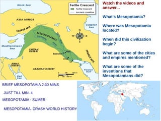 Ancient Mesopotamia Ancient Mesopotamia Look for the answers to your questions as you read. Big Ideas About Ancient Mesopotamia. Geography Civilizations arise in geographic locations that. Civilization Begins In Mesopotamia - ProProfs Quiz Mar 22, 2022 ... The quiz is a review of the concepts of Early civilizations in the Fertile Crescent and Mesopotamia. It consists of vocabulary and key ...
