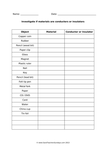 Conductor and insulator worksheet