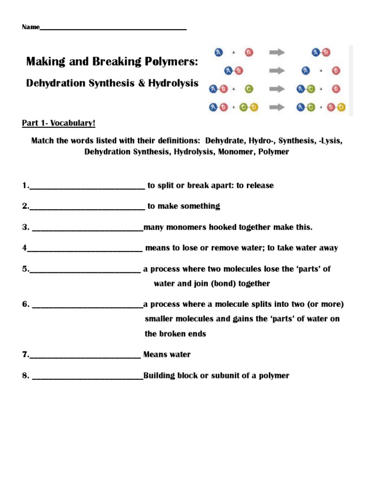 making pulymers dehydration symthesis hydrolysis This worksheet is the easier of two worksheets that I use in my classroom to help them. Compared to the other Dehydration Synthesis and Hydrolysis Worksheet, this worksheet is more of an introduction to the concepts. In addition to a vocabulary and labeling section, there are six reactions that students must analyze and answer questions about.