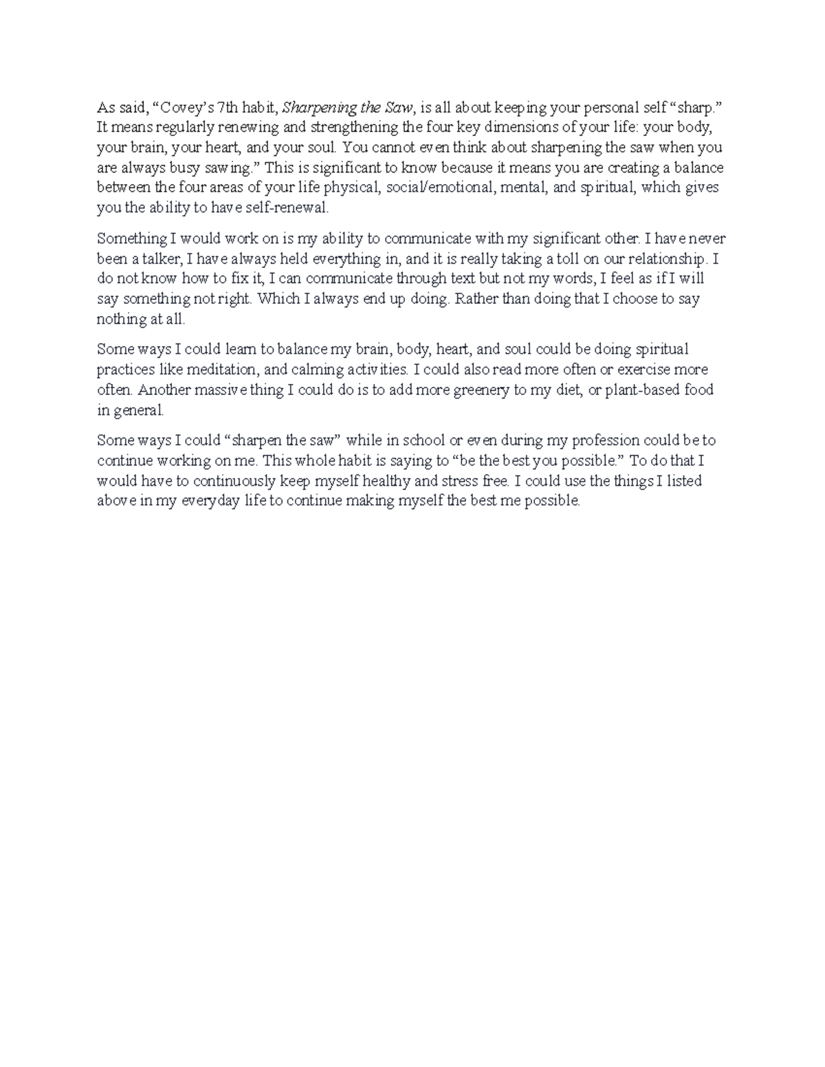Habit #7: Sharpen the Saw - Student Leadership To "sharpen your saw" means that sometimes you need to stop and have a break, and reflect on yourself and to relax. Sometimes you need to stop and just take a deep breath. By doing this is will help you overall performance at school, sports, or even family. Every single day I do some sort of psychical activity. I find that exercising relaxes me.