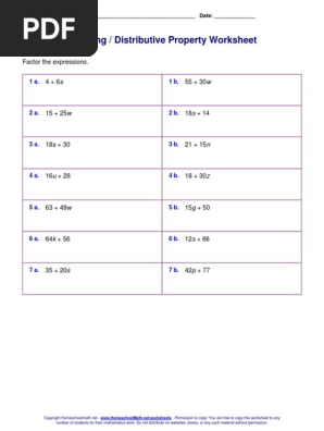 Factoring / Distributive Property Worksheet Factoring / Distributive Property Worksheet. Factor the expressions. 1 a. 55d + 10. 1 b. 12 + 22u. 2 a. 24 + 28z. 2 b. 14 + 12w. 3 a. 84a + 48.