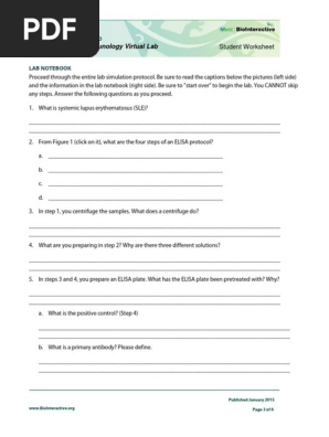 Biology lab nine - The Immunology Virtual Lab Student Worksheet ... Answer the following questions as you proceed. 1. What is systemic lupus erythematosus (SLE)? This is an autoimmune disease where antibodies fight the cells in the body. 2. From Figure 1 (click on it), what are the four steps of an ELISA protocol? A.