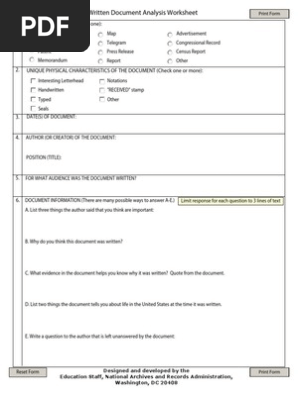 PDF Written Document Analysis Worksheet - National Archives and Records ... 1. TYPE OF DOCUMENT (Check one): Newspaper Letter Patent Memorandum Map Telegram Press Release Report Advertisement Congressional Record Census Report Other Written Document Analysis Worksheet 2. UNIQUE PHYSICAL CHARACTERISTICS OF THE DOCUMENT (Check one or more): Interesting Letterhead Handwritten Typed Seals Notations "RECEIVED" stamp Other 3. DATE(S) OF DOCUMENT: 4. Document Analysis Worksheets - National Archives The following document analysis worksheets were designed and developed by the Education Staff of the National Archives and Records Administration. You may find these worksheets useful as you introduce students to various documents. Thousands of documents are available throughout sections of the National Archives website, including: Teaching With Documents, Online Exhibits, and the National Archives Catalog .