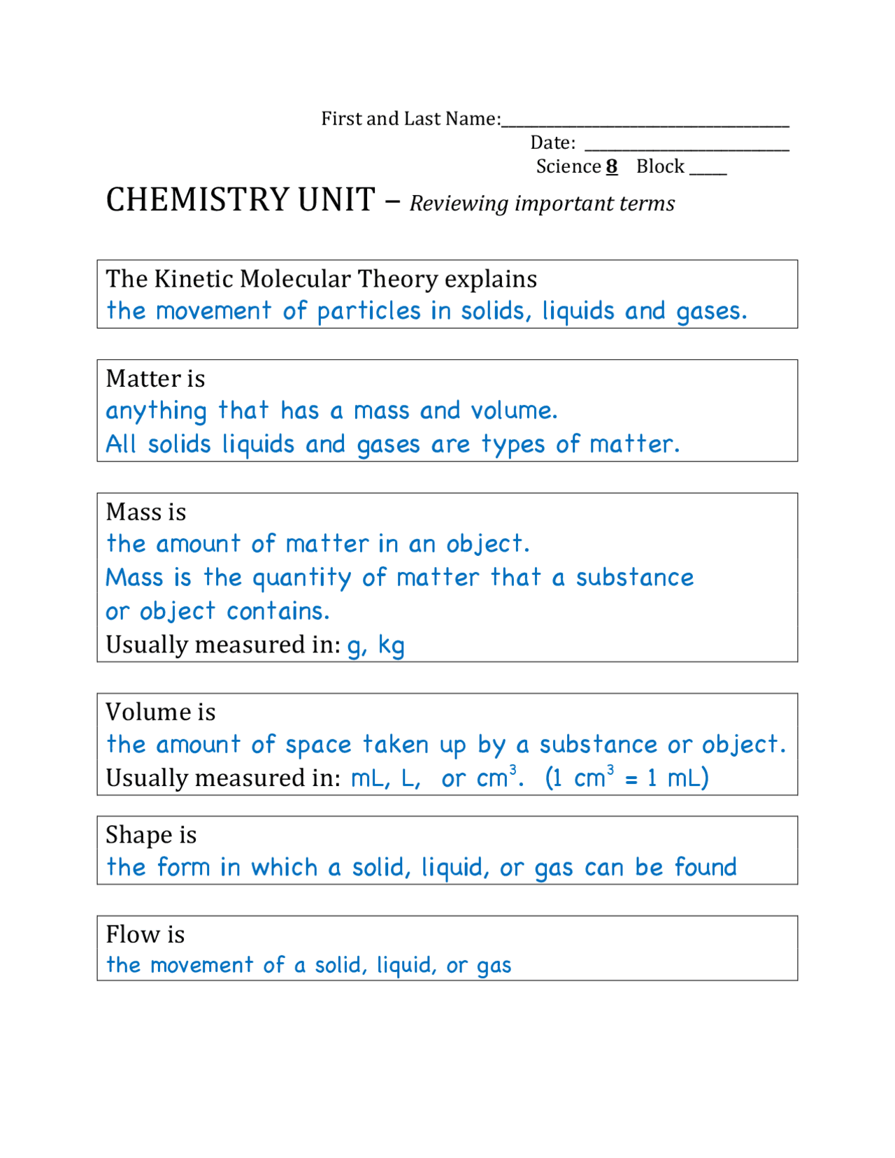 Science 8 States Of Matter Answer Key (PDF) - staging.friends-library science-8-states-of-matter-answer-key 2/11 Downloaded from staging.friends-library.org on September 18, 2022 by guest mini posters and answer key included and can be used effectively for test prep and your whole-class. All of our content is aligned to your State Standards and are written to Bloom's Taxonomy and STEM initiatives. States of Matter Worksheet - SCIENCE 8 - STATES OF MATTER WORKSHEET ... SCIENCE 8 - STATES OF MATTER WORKSHEET NAME: Vocabulary Contracts Kinetic molecular theory Move around quickly State of matter Expands Mass Slide past each other Vibrate Faster Matter Slower Volume. Use your notes from pages 1 - 2 and the terms in the vocabulary box to fill in the blanks for the following nine questions. You will not need to use every term. Chapter 8: States of Matter STUDY GUIDE Flashcards | Quizlet The amount of thermal energy must increase or decrease in the matter in order for the matter to change into one state to another. Kinetic Molecular Theory, how it describes gas. The kinetic molecular theory states the basic assumptions that are used to describe particles and their interactions in gases and other states of matter. Science 8 States Of Matter Worksheets - K12 Workbook Displaying all worksheets related to - Science 8 States Of Matter. Worksheets are Section 1 matter main idea, States of matter unit, Lab activity matter on the move 1, Name states of matter, Name states of matter, Revision booklet grade 6 june 2018, Basic states of matter, Statesofmatter. *Click on Open button to open and print to worksheet.