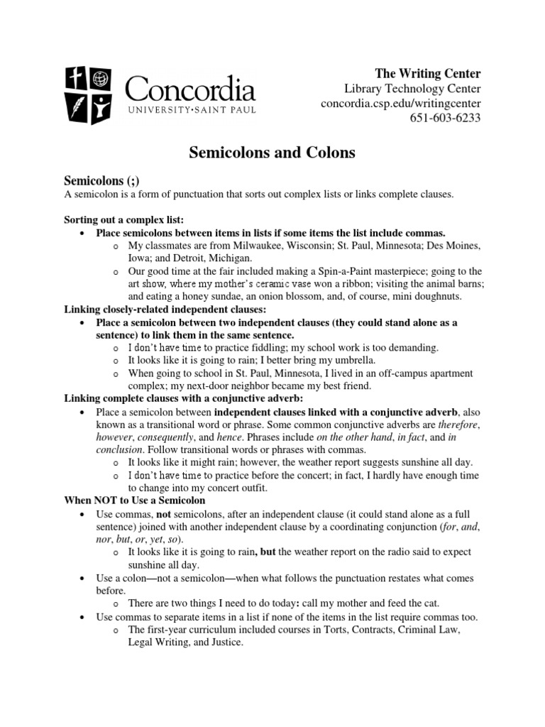 PDF Writing Center - Jccc WRITING CENTER Semicolons and Colons Last edited: 04/04/2021 DRR 4 4. Use a colon to link a main clause with an appositive.An appositive is a noun or noun phrase that re-names a noun or pronoun. To test this usage, substitute namely for the colon. If namely makes sense, the colon has been used properly.