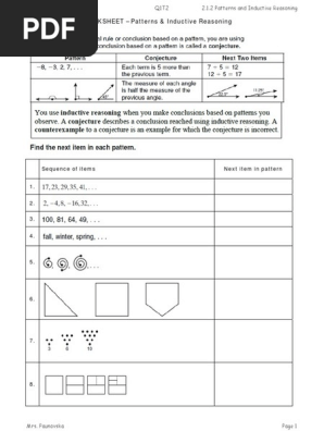 Patterns And Inductive Reasoning - Printable Worksheets Some of the worksheets displayed are 1 1 patterns and inductive reasoning, Patterns and inductive reasoning work 2 1, Inductive reasoning, Inductive and deductive reasoning, Inductive reasoning geometry 2, Lesson inductive reasoning, Inductive and deductive reasoning, Deductive reasoning exercises for attention and executive.