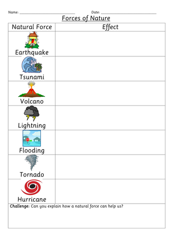 Forces Of Nature Teaching Resources | Teachers Pay Teachers These worksheets are to use as students explore forces of nature on various websites. The students answer questions about earthquakes, earthquakes, tornadoes, or volcanoes explore case studies of historical disasters. Additional websites are provided for each area so that students can expand their exploration. An answer key is provided.