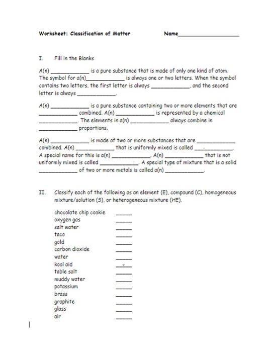 Classification of matter worksheet with answers