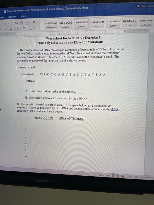 Dna rna protein synthesis and mutation worksheet answers. Nucleus - Definition and Examples - Biology Online Dictionary Nov 03, 2021 · The nucleolus, in turn, is composed of proteins, DNA, and RNA. While the nucleus is largely involved in gene regulatory functions, the nucleolus functions primarily for the creation of ribosomes essential for protein synthesis. 9700 BIOLOGY: MARK SCHEME For The May/June 2013 Series a level past year Basic Genetics - University of Utah The 4 Types of DNA and Molecular Genealogy DNA analysis can help build the family tree. Find out about autosomal, x chromosome, y chromosome, and mitochondrial DNA. Genes and Chromosomes - Merck Manuals Consumer Version The complementary strand of RNA is called messenger RNA (mRNA). The mRNA separates from the DNA, leaves the nucleus, and travels into the cell cytoplasm (the part of the cell outside the nucleus—see figure ). There, the mRNA attaches to a ribosome, which is a tiny structure in the cell where protein synthesis occurs.
