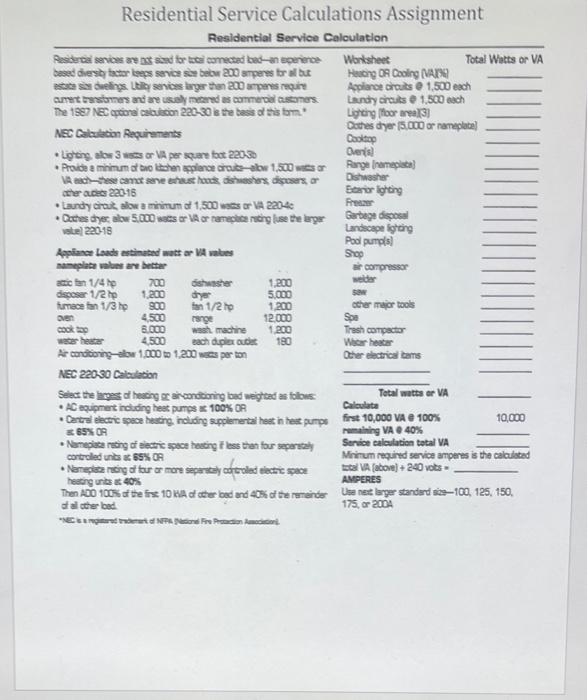 PDF SFR, Main Electrical Service/Sub Panel Calculation Worksheet Calculated Load for Service =Line (9)/240 = Amps Clark County Department Of Building SFR, Main Electrical Service/Sub Panel Calculation Worksheet 2008 NEC EFAGC 05.09 Standard Calulation :Article 220 NEC (may be reduced per Table 220.55) Sq. ft x 3 VA/ft2 = Form 1004 - Minimum 5000VA or nameplate if larger] Microwave Other