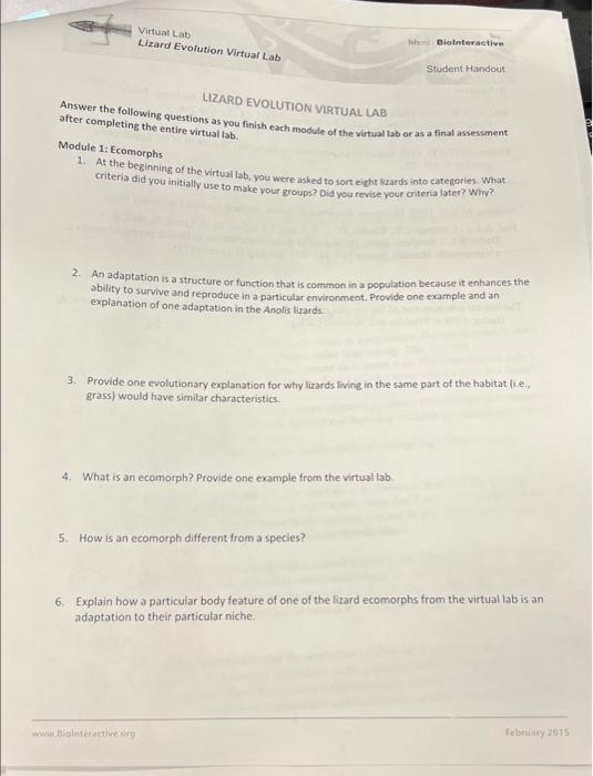 Lizard Virtual Lab Module 2 Flashcards | Quizlet Answer: Similar adaptations evolved on different islands. The evidence clearly shows that evolution can repeat itself; lizards that occupy similar habitats will evolve the same types of adaptations. For example, on all of the islands, lizards living in the grass and bushes have evolved slender bodies and long tails. Lizard-Evolution-Virtual-Lab-Student-Worksheet 1 Virtual Lab. Lizard Evolution Virtual Lab Student Handout LIZARD EVOLUTION VIRTUAL LAB Answer the following questions as you finish each module of the virtual lab or as a final assessment after completing the entire virtual lab. Module 1: Ecomorphs 1. At the beginning of the virtual lab, you were asked to sort eight lizards into categories. Lizard Evolution Virtual Lab | HHMI's BioInteractive Lizard Evolution Virtual Lab Student Worksheet | PDF - Scribd LIZARD EVOLUTION VIRTUAL LAB Answer the following questions as you finish each module of the virtual lab or as a final assessment after completing the entire virtual lab. Module 1: Ecomorphs 1. At the beginning of the virtual lab, you were asked to sort eight lizards into categories. What criteria did you initially use to make your groups? Did you revise your criteria later?