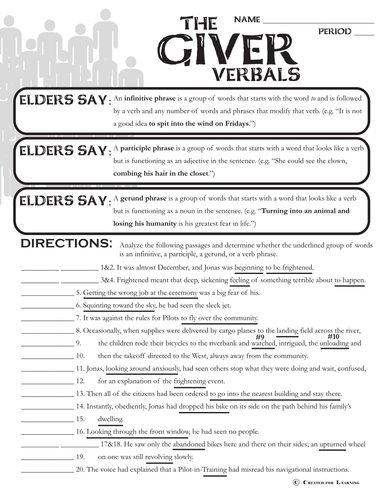 The Giver Worksheet Answer Key - myilibrary.org The Giver Answers Worksheets - Learny Kids. The Giver Answers Displaying top 8 worksheets found for - The Giver Answers. Some of the worksheets for this concept are The giver answer key, Answers to the giver packet, Giver activity guide answers, Lois l the giver, Vocabulary chapters 1, The giver by lois lowry, Teachers pet publications, Name. The Giver Verbals Worksheet Answer Key - myilibrary.org Grade 8 ELA Unit 6: The Giver - Santa Ana Unified School District. Conduct short research projects to answer a question ... Explain the function of verbals (gerunds, participles, ... sentences of the key ideas by.