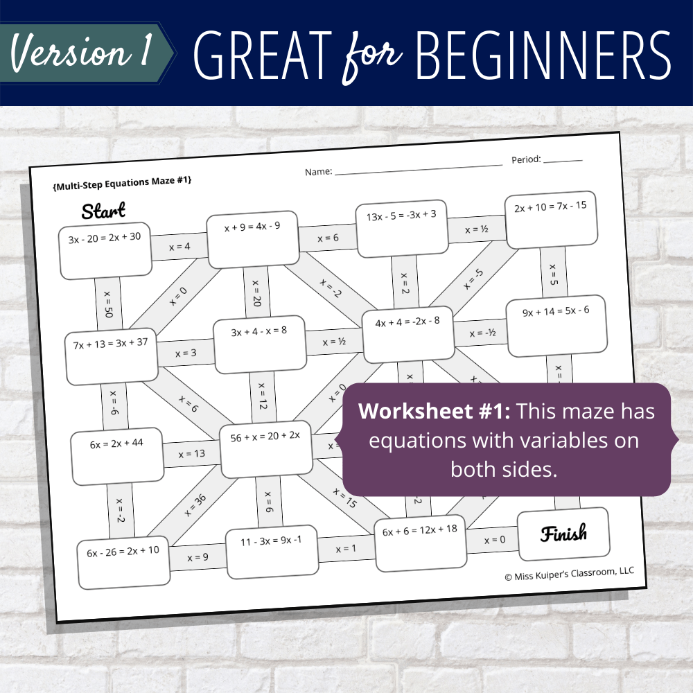 Search Printable 6th Grade Algebra Worksheets - Education WebSolving One-Step Equations Maze. Practice solving one-step addition, subtraction, multiplication, and division equations as you make your way through this fun maze! 6th grade. Math. Worksheet. How to Simplify Algebraic Expressions. Worksheet. How to Simplify Algebraic Expressions. Learn how to simplify algebraic expressions step by step … Maze Solving Equations Activities - Algebra 1 Coach Solving Equations with Variables on Both Sides 2-4 Solving Equations with Variables on Both Sides - Answers - Maze Activity (PDF - Member Only) 2-4 Solving Equations with Variables on Both Sides - Maze Activity (Editable - Member Only) Solving Equations with Variables on Both Sides - Maze Activity (PDF - FREEBIE) Literal Equations and Formulas 12 Activities that Make Practicing Two-Step Equations Pop Web29.12.2017 · One key with two-step equations is that students need to see all four operations. If they get really good with two-step equations, then they’ll have an easier time learning multi-step equations. This skill can be practiced with the whole class, with partners, or individually. When students struggle in the whole group, then I know to pull …